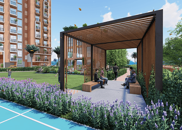 The project focuses on sustainable living with features such as rainwater harvesting, sewage treatment plants, and sufficient common area lighting. It also provides recreational facilities including a club house, a gymnasium, and designated spaces for senior citizens and children.